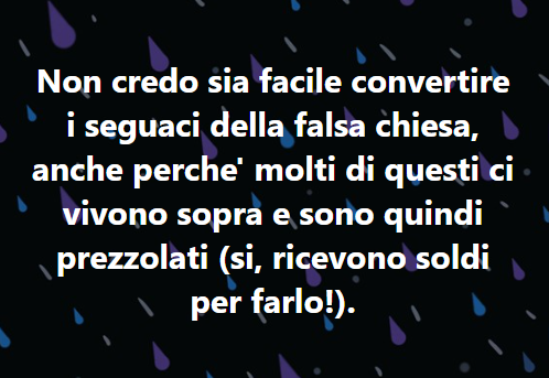 Categorie LA RICERCA DELLA VERA FEDE - THE SEARCH OF TRUE FAITH SULLA POSSIBILE CONVERSIONE DEI PRO-BERGOGLIANI Autore articolo Di Max Tex Data dell'articolo 21 Luglio 2021 Non credo sia facile convertire i seguaci della falsa chiesa, anche perche’ molti di questi ci vivono sopra e sono quindi prezzolati (si, ricevono soldi per farlo!). COSA NE PENSATE VOI? ← QUESTA E’ TROPPO GROSSA! THIS IS TOO BIG! → LA PROFEZIA DEMONIACA SULLA DITTATURA MONDIALE VAX-JAB